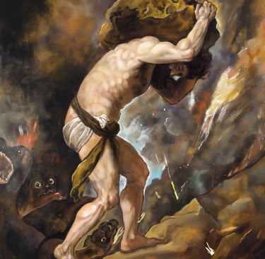 En la mitología griega, Sísifo es castigado por los dioses debido a su extraordinaria astucia. Su condena consiste en empujar eternamente un enorme peñasco montaña arriba hasta la cima, solo para verlo caer nuevamente al valle, obligándolo a repetir la tarea una y otra vez, sin fin.